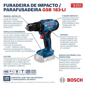 A primeira escolha para os desafios de obra. A furadeira e parafusadeira de impacto à bateria GSB 183-LI 18V é perfeita para perfurações com ou sem impacto e parafusamentos em metal, alvenaria e madeira. É a melhor opção em 18V com a potência e robustez que só a Bosch pode oferecer para um trabalho mais produtivo! Conta com 60NM de torque máximo para aguentar qualquer desafio e um diâmetro máximo de perfuração de 35mm em madeira e 10mm em aço. A furadeira e parafusadeira de impacto à bateria GSB 183-LI conta com mandril metálico que trava melhor o acessório, além de oferecer maior robustez, durabilidade e um sistema de encaixe de aperto rápido do mandril que poupa tempo e esforço. A ferramenta acompanha: 1 bateria 18V de 2,0 Ah, 1 carregador GAL 18V-20, Kit com 10 bits, 1 extensor para bits, kit com 12 brocas (4 para madeira, 4 para metal e 4 para alvenaria), 1 manual de instruções da ferramenta, 1 manual de instruções do carregador. Garantia 1 ano Bosch + 1 ano adicional fazendo o cadastro no aplicativo BeConnected. Todas as ferramentas a bateria de 18V de todas as marcas atingem 20V quando estão em repouso e 18V quando estão realmente trabalhando e algumas marcas optam por comunicar a  em trabalho e outras optam por comunicar a  em repouso, porém na realidade todos os produtos disponíveis no mercado da categoria 18V-20V fazem parte da mesma especificação técnica de produto.