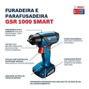 Produto Furadeira e Parafusadeira Marca Bosch Uso Indicado Para madeira, metal e plástico Potência 18 W Potência da Bateria 12 V Mandril 1/4 Capacidade do Mandril 6 mm Tensão Elétrica Bivolt Modelo GSR 1000 Possui Impacto Sem Impacto Possui Controle de Torque Sem Controle de Torque Torque 6 Nm Torque Máximo 15 Nm Alimentação Bateria Rotação Máxima 700 rpm Capacidade de Perfuração da Madeira 10 mm Capacidade de Perfuração do Metal 6 mm Capacidade Máxima de Perfuração 10 mm Ferramenta Intercambiável Não Acompanha Bateria Sim Baterias Indicadas Lítio Quantidade de Baterias Indicadas 1 bateria s Tipo da Bateria Íons de Lítio Linha Bosch Professional Produto Acompanha Embalagem Sim Tipo de Embalagem Maleta Altura da Embalagem 100 mm Largura da Embalagem 195 mm Profundidade da Embalagem 302 mm Peso do Produto na Embalagem 1,726 Kg Conteúdo da Embalagem 1 Parafusadeira GSR 1000 Smart, 1 manual de instruções, 1 carregador, 10 bits e 1 extensor universal Dimensão da Embalagem 100x195x302 mm Peso do Produto 0,9 Kg Acompanha Maleta Sim Material da Maleta Plástico Cor Azul Tonalidade Azul Diâmetro do Encaixe 1/4 Aviso Recomendado usar material de proteção EPI para manuseio mais seguro do produto. Dica Você pode utilizar vários tipos de brocas com esse produto. Desde as brocas de 1mm à 6mm às brocas de perfuração de madeira, metal e plástico. Lembre-se: ao usar qualquer ferramenta elétrica, use equipamentos de segurança, como luvas e óculos de segurança. Garantia do Fabricante 12 mes es