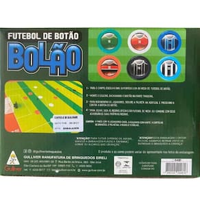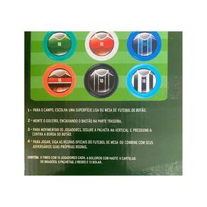 conteúdo da embalagem: 6 times com 10 jogadores cada, 6 goleiros com haste 6 cartelas de brasoes, 6 palhetas, 2 redes e 12 bolas. Dimensões aproximadas do produto: altura x largura x comprimento/profundidade . Dimensões aproximadas da embalagem: 9cm x 20cm x 26cm altura x largura x comprimento/profundidade . Material/composição: plástico. Idade mínima recomendada: a partir de 3 anos. Participantes: a partir de 2 pessoas. Alimentação: não se aplica. Marca: gilliver