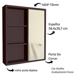 Características adicionais: Porta de correr com espelho, 6 nichos porta objetos; gabinete conta com 1 porta de correr, 5 nichos, pés em ABS reguláveis.