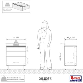 O Gabinete 2G 1 Gavetão Top Class da Batrol é a solução perfeita para quem busca otimizar o espaço e adicionar um toque de modernidade à cozinha. Com design clean e funcional, ele oferece amplo espaço para armazenar seus utensílios e mantimentos, deixando tudo à mão. Dimensões: - Altura: 84,5cm; - Largura: 70cm; - Profundidade: 44,8cm; - Design moderno e versátil: Se adapta a diferentes estilos de cozinha, combinando com diversos tipos de decoração. - Amplo espaço interno: Com duas gavetas e um gavetão, oferece espaço suficiente para organizar pratos, copos, panelas e outros utensílios. - Material de qualidade: Confeccionado com MDP, um material resistente e durável, garantindo a qualidade do produto por muitos anos. - Fácil de limpar: A superfície lisa facilita a limpeza, mantendo o gabinete sempre impecável. - Instalação prática: Acompanha todos os acessórios para uma instalação rápida e segura. Instruções de limpeza: limpar com pano úmido, detergente neutro ou aspirador de pó. Embalagem: Todos os nossos produtos são devidamente embalados e com total segurança. Montagem: Não montamos os produtos. O serviço de montagem deve ser contratado pelo cliente. Atenção: Não nos responsabilizamos, no ato da entrega, por desmontagens, subir escadas, elevadores ou transporte por guincho para apartamentos. Eventuais despesas são de responsabilidade do cliente. Confira as dimensões deste produto e certifique-se de que passará normalmente por supostos elevadores, portas, escadas e/ou corredores em forma da letra "S".