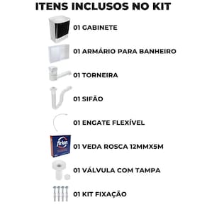 Gabinete 2 portas suspenso para banheiro com lavatório + armário + torneira + engate flexível + fita veda rosca