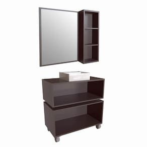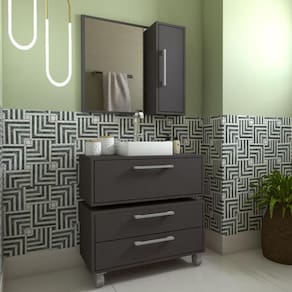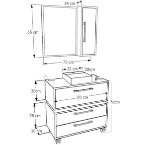O conjunto CMBL2012 é produzido em MDP 15mm e acabamento FF fosco. A espelheira possui espelho 3mm, 1 porta com dobradiça metálica, 2 prateleiras internas e puxador em ABS. Já o gabinete possui 1 porta basculante com pistão a gás e puxador em ABS. O balcão baixo possui 2 gavetas que suportam 10 kgs cada, com corrediças metálicas, 4 rodízios plásticos e puxadores em ABS. Estrututa do fundo em 3mm. Produto suporta até 20kgs. Conteúdo da embalagem: móvel, ferragens e manual de montagem. A fixação das peças e/ou acessórios é feita por parafusos, cavilhas e minifix. Necessita fixação na parede e acompanha os parafusos para a fixação. Para uma limpeza mais efetiva, utilizar apenas pano macio umedecido e sabão neutro. Não utilizar produtos abrasivos. Garantia de 03 meses contra defeitos de fabricação. Medidas do produto espelheira (AxLxP): 65x70x14cm. Medidas do produto gabinete (AxLxP): 30x80x40cm. Medidas do produto balcão baixo (AxLxP): 48x80x40cm. Peso total do produto: 37,83kgs. Produto acompanha cuba branca em mármore sintético.