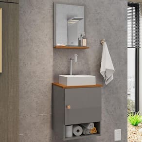 Material do gabinete: MDP de 12 mm no painel e 15 mm na prateleira com espelho de 03 mm de espessura;