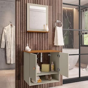 Material da espelheira: MDP de 12 mm no painel e 15 mm na prateleira com espelho de 03 mm de espessura;
