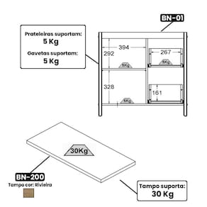 - Tampo em MDP 30 mm padrão Riviera (tonalidade de cor bege) que suporta até 30 kg.