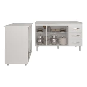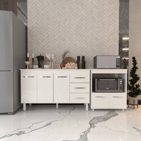 Altura com os pés: 83,5 cm Altura sem os pés: 67 cm Largura: 138 cm Profundidade: 50 cm Material: MDP (madeira) Portas: 3 portas Gavetas: 3 gaveta Prateleiras: 1 prateleira Puxadores: 6 puxadores plásticos cromados Pés: 5 pés reguláveis de plástico Altura dos pés: 16,5 cm Regulagem dos pés: Somente para nivelamento, até 18 cm Corrediças: Metálicas Indicações de Uso: Cozinha