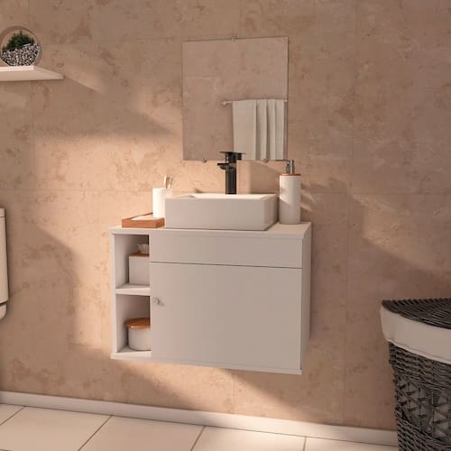 O Gabinete de Banheiro 60cm oferece uma solução prática e elegante para organizar itens de higiene. Composto por nichos, uma porta e uma cuba, ele otimiza o espaço com estilo e funcionalidade. Seu design moderno se adapta a diferentes tipos de decoração, tornando-o ideal para banheiros compactos ou amplos. Além de acompanhar um kit de montagem, o gabinete é resistente e fácil de instalar, proporcionando praticidade no dia a dia. Combinando com diversos estilos de ambientes, ele é a escolha perfeita para quem busca beleza e organização em um só produto. Acabamento da Porta: BP Acabamento da Prateleira: BP Altura do Espelho: 41 cm Ambiente Principal: Banheiro Complexidade da Montagem: Média: pode ser montado por mais de uma pessoa e/ou necessite de maior conhecimento para montagem Cor: Branco Cor do Produto: Branco Cor Interna: Branco Escala de Brilho: Brilhante Escala de Brilho da Porta: Brilhante Escala de Brilho da Prateleira: Brilhante Espessura do Espelho: 4 mm Formato do Espelho: Quadrado Itens Inclusos: Cuba, espelho, kit de montagem e manual Largura do Espelho: 28 cm Linha ou Coleção: Itália Manual de Montagem e Instalação: https://product-hub-prd.madeiramadeira.com.br/950010/documents/a0e99038-9dd5-430b-8918-2b25d7908875235235058811726692686696.pdf Material da Porta: MDP Material da Prateleira: MDP Material do Puxador da Porta: ABS Material Principal: MDP Necessita Montagem: Sim Origem do Produto: Nacional Peso: 11 kg Peso Máximo por Prateleira: 5 kg Possui Espelho: Sim Possui Pés: Não Possui Portas: 01 Possui Prateleiras: 01 Recomendações de Uso, Manutenção e Limpeza: Limpeza Regular: Utilize um pano macio levemente umedecido com água e sabão neutro para limpar o gabinete. Evite Produtos Abrasivos: Não utilize produtos de limpeza abrasivos, solventes ou produtos químicos agressivos, pois podem danificar o acabamento do MDP. Secagem Adequada: Após a limpeza, seque imediatamente o gabinete com um pano seco para evitar que a umidade se acumule na superfície. Sistema de Montagem: Parafusos e Cavilha Suporta Até (kg): 30 kg Tipo de Dobradiça/Corrediça da Porta: Aço Tipo de Fixação do Espelho: Botão Francês Tipo de Porta: Bater Tipo de Puxador da Porta: Externo Marca: Brovalia