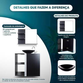 Conjunto é composto por: 1 Gabinete Harpia medindo: Altura 50cm x Largura 55cm x Profundidade 35cm 1 Cuba de Resina de Poliéster medindo: 33,5cm de diâmetro e 8cm de altura 1 Espelheira Audaz medindo: Altura 45cm x Largura 55cm x Profundidade 13cm