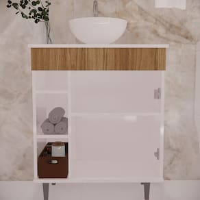 Gabinete de banheiro com pés e cuba, perfeito para otimizar e organizar seu espaço com estilo. Ideal para armazenar produtos de higiene pessoal, oferece praticidade e design funcional. Com estrutura robusta, é fácil de instalar e se adapta a diversos tamanhos de banheiros. Sua cuba é moderna e compacta, garantindo sofisticação ao ambiente. Combina perfeitamente com decorações contemporâneas, tornando-se uma solução elegante para banheiros residenciais ou comerciais. Acabamento da Porta: BP Acabamento da Prateleira: BP Acabamento dos Pés: Polipropileno Altura dos Pés: 15 cm Ambiente Principal: Banheiro Complexidade da Montagem: Média: pode ser montado por mais de uma pessoa e/ou necessite de maior conhecimento para montagem Cor: Branco/Marrom Cor do Produto: Branco/Marrom Cor Interna: Branco Escala de Brilho: Brilhante Escala de Brilho da Porta: Brilhante Escala de Brilho da Prateleira: Brilhante Itens Inclusos: 1 Armário + 1 Cuba , Kit Montagem e Manual de Montagem Linha ou Coleção: Itália Com Pés Manual de Montagem e Instalação: https://product-hub-prd.madeiramadeira.com.br/950020/documents/8c966902-82ca-4c80-b8b7-a1e678dc2dc02358652588117267712891413.pdf Marca: Brovalia Material da Porta: MDP Material da Prateleira: MDP Material do Puxador da Porta: ABS Material dos Pés: ABS Material Principal: MDP Necessita Montagem: Sim Origem do Produto: Nacional Pés Reguláveis: Sim Peso: 14 kg Peso Máximo por Prateleira: 5 kg Possui Espelho: Não Possui Pés: 04 Possui Portas: 01 Possui Prateleiras: 03 Possui Rodízio: Não Recomendações de Uso, Manutenção e Limpeza: Limpeza Regular: Utilize um pano macio levemente umedecido com água e sabão neutro para limpar o gabinete. Evite Produtos Abrasivos: Não utilize produtos de limpeza abrasivos, solventes ou produtos químicos agressivos, pois podem danificar o acabamento do MDP. Secagem Adequada: Após a limpeza, seque imediatamente o gabinete com um pano seco para evitar que a umidade se acumule na superfície. Sapatas Niveladoras: Não Sistema de Montagem: Parafusos e Cavilha Suporta Até (kg): 30 kg Tipo de Dobradiça/Corrediça da Porta: Aço Tipo de Porta: Bater Tipo de Puxador da Porta: Externo Marca: Brovalia