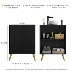 O Gabinete Banheiro 2 Portas Retrô 63cm Multimóveis é produzido em MDP com acabamento acetinado (cerca de 20% de brilho), que garante maior durabilidade, facilidade na limpeza, além de um acabamento superior. Com 2 portas, possui um excelente espaço interno para organizar itens de higiene, toalhas e demais objetos (a prateleira interna suporta 8 Kg e o tampo 9 Kg). Os pés retrô, em polipropileno, dão um charme especial ao móvel deixando-o com um visual leve e permitindo você compor um ambiente com ar vintage e moderno ao mesmo tempo. Uma ótima opção para deixar seu banheiro bonito, prático e organizado. Não acompanha torneira e cuba.