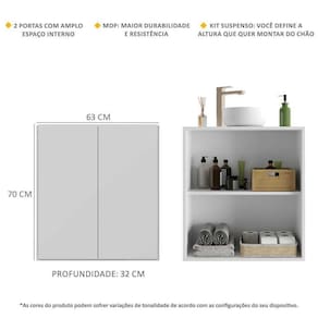 O Gabinete Banheiro 2 Portas Suspenso 63cm Multimóveis é produzido em MDP com acabamento acetinado (cerca de 20% de brilho), que garante maior durabilidade, facilidade na limpeza, além de um acabamento superior. Com 2 portas, possui um excelente espaço interno para organizar itens de higiene, toalhas e demais objetos (a prateleira interna suporta 8 Kg e o tampo 9 Kg) e ainda acompanha kit para ser montado de forma suspensa, conforme a altura que você quiser do chão. Uma ótima opção para deixar seu banheiro bonito, prático e organizado. Não acompanha torneira e cuba.