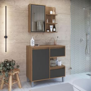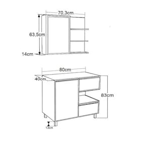 O conjunto para banheiro CJ2001 é produzido em MDP 15mm e acabamento FF fosco. O gabinete possui 1 porta de bater com dobradiça metálica, 1 prateleira interna, 2 gavetas com corrediças metálicas, 4 pés em ABS com altura de 13cm e 1 nicho aberto. Já a espelheira possui 1 porta de bater com espelho 3mm colado, dobradiça metálica, 2 prateleira internas e 2 prateleiras externas. Produto suporta até 45kgs. Conteúdo da embalagem: móvel, ferragens e manual de montagem. A fixação das peças e/ou acessórios é feita por parafusos e cavilhas. Para uma limpeza mais efetiva, utilizar apenas pano macio umedecido e sabão neutro. Não utilizar produtos abrasivos. Garantia de 03 meses contra defeitos de fabricação. Medidas do produto gabinete (AxLxP): 83x80x40cm. Medidas do produto espelheira (AxLxP): 63,5x70,3x14cm. Peso total do produto: 38,11kgs. Não acompanha cuba. Marca: Não Informado
