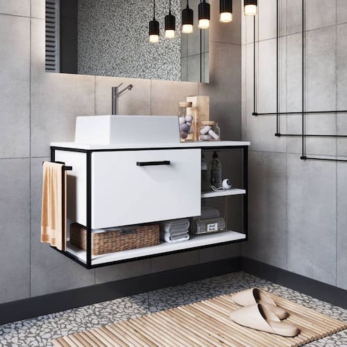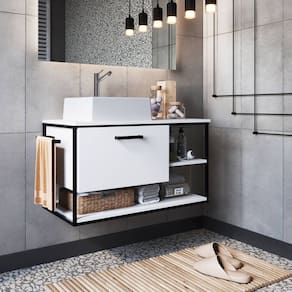 Armário de banheiro para parede com cuba de sobrepor branca e um porta toalhas na lateral para deixar seu ambiente muito mais organizado e espaçoso. Possui uma ampla gaveta e duas prateleiras ideal para guardar toalhas, rolos de papel higiênico e itens de higiene.