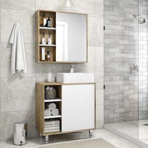 O Gabinete Banheiro com Cuba e Espelheira 80cm Multimóveis CR10067 é produzido em MDP 15mm com acabamento semibrilho, que garante maior durabilidade e facilidade de limpeza. A espelheira possui 1 porta com prateleiras internas e nichos na lateral (suporta até 3kg). O balcão com cuba de sobrepor em mármore sintético (já vai com furação para a instalação da torneira) proporciona mais requinte ao seu banheiro. Com 1 porta (sistema de amortecimento nas dobradiças) e nichos conta com amplo espaço para organização de toalhas, itens pessoais e de higiene. Os pés com regulagem de altura permitem um perfeito nivelamento do móvel.