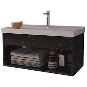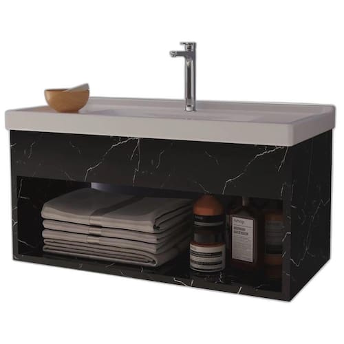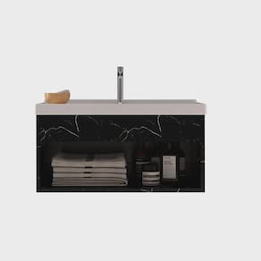 Gabinete para banheiro com cuba e nicho suspenso - preto marmorizado - beta cerrocha Altura: 31cmLargura: 63cmProfundidade: 31,5cmProduzido em mdf;.Acompanha lavatório em.Torneira não inclusa;.Pintura ultravioleta com acabamento brilho. espelharia nao inclusa Com linhas retas e continuas, o gabinete beta - cerocha, faz-se contemporâneo e atemporal sendo perfeito para o seu lavabo. Proporciona estilo, e por ser suspenso contibui para a limpeza diária do seu ambiente, conta com um amplo nicho para que seus itens de banho possam ficar sempre à mão. Dimensões do produto montado: altura: 31 cm largura: 63 cm profundidade: 31,5 cm observações: - produzido em mdf; - acompanha lavatório em mármore sintético com tecnologia bmc: mais resistente e mais leve; - com nicho; - torneira não inclusa; - pintura ultravioleta com acabamento brilho