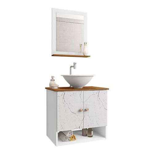 Material da espelheira: MDP de 12 mm no painel e 15 mm na prateleira com espelho de 03 mm de espessura;
