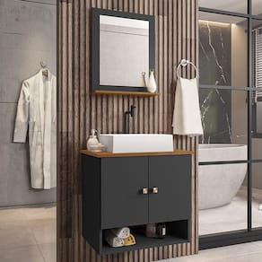 Material da espelheira: MDP de 12 mm no painel e 15 mm na prateleira com espelho de 03 mm de espessura;