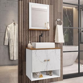 Material da espelheira: MDP de 12 mm no painel e 15 mm na prateleira com espelho de 03 mm de espessura;