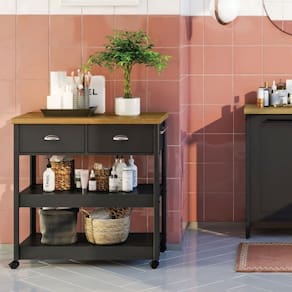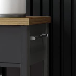 - Puxadores e porta-toalha metálicos.