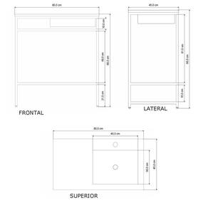 Características Gerais do Produto: - Altura: 96 cm - Garantia: Garantia de 3 meses - Largura: 80 cm - Madeira: MDF - MDP 15mm - Marca: Venturi - Material Estrutura: Metalon - Material da Cuba: Cuba em Pedra Ardósia com Pintura PU - Montagem Necessária?: Não - Pedra: Pedra Ardósia - Peso: 35 kg - Profundidade: 45 cm - Tipo de Instalação: De Chão (com 4 pés fixos em metal)