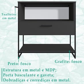 Gabinete Para Banheiro Industrial 80 CM 1028, para deixar seu ambiente mais moderno e adicionar um toque especial de sofisticação. Possui estrutura em aço e MDP de 15 mm, porta basculante e gaveta, corrediças e dobradiças metálicas. Possui também puxadores em metal e toalheiro lateral, além de prateleira para armazenamento de seus itens mais utilizados e/ou decoração. Com design industrial e bom gosto, ele acrescentará comodidade e um toque conceitual ao seu banheiro. Este móvel chegará na sua casa separado em 01 volume.