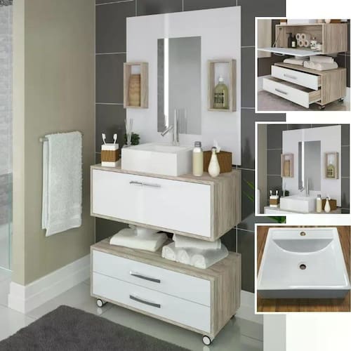 Conjunto balcão gabinete de banheiro completo moderno.