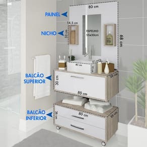 Acompanha balcão inferior, balcão superior, painel, nichos, cuba e espelho.