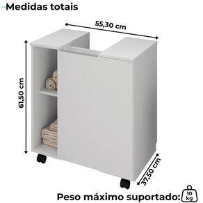 Gabinete para Banheiro Pequin, ideal para otimizar o espaço com praticidade no dia a dia. Estrutura em MDP (12mm) com acabamento em pintura UV texturizada. Possui porta, dobradiças metálicas, puxador (alumínio), nichos internos/ externos e rodízios em plástico. Ideal para encaixe em pias de coluna. Este produto será entregue em 1 volume.