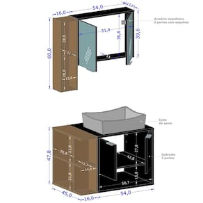 Gabinete: MDP de 15 mm e 12 mm. Espelheira: MDP de 12 mm no painel e 15 mm na prateleira com espelho de 03 mm de espessura. Cuba: Mármore sintético.Vendido e entregue por Loja DoceLar