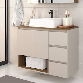 O balcão gabinete Vitória possui design moderno e funcionalidade para organização eficiente! Possui 2 portas com bastante espaço interno, 3 gavetas e 1 nicho, que são ideais para armazenar produtos de higiene, toalhas e outros itens essenciais. Acompanha cuba de sobrepor branca.