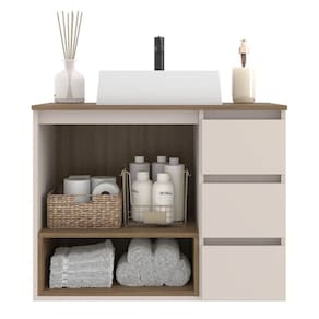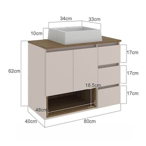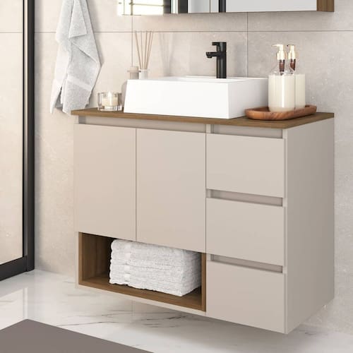 Gabinete Banheiro Suspenso 80cm Vitória com 02 Portas 03 Gavetas e Nicho com Cuba Mel/Arenas - Bege