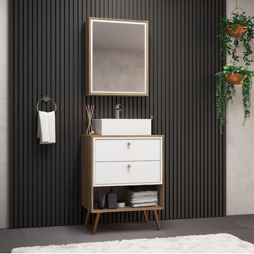 Toda elegância e praticidade com diferencial no design robusto o gabinete com para banheiro Gael se adapta aos mais diversos banheiros.