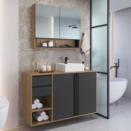O conjunto para banheiro CJ5240 é bastante espaçoso e ideal para quem quer seus pertences muito bem organizados. O balcão possui duas portas com amplo espaço interno, uma prateleira, duas gavetas também espaçosas e mais dois nichos para você colocar toalhas, decoração e muito mais. Já a espelheira possui 2 portas com espelhos e um lindo nicho. Venha conferir. Produto acompanha cuba branca. Acabamento da Cuba: Alto Brilho Acabamento da Gaveta: Finish Foil Acabamento da Porta: Finish Foil Acabamento da Prateleira: Finish Foil Acompanha Cuba: Sim Acompanha Gaveteiro: Não Acompanha Manual de Instalação: Sim Acompanha Parafusos Para Fixação Na Parede: Sim Acompanha Tampo: Sim Acompanha Válvula: Não Altura do Espelho: 49 cm Ambiente Principal: Banheiro codigo_ean: 7900288232441 Complexidade da Montagem: Média: pode ser montado por mais de uma pessoa e/ou necessite de maior conhecimento para montagem Cor: Mel/Grafite Cor da Cuba: Branco Cor da Gaveta: Preto Cor da Porta: Preto Cor do Produto: Mel/Grafite Cor Flex: Não Cor Interna: Mel Escala de Brilho: Fosco Escala de Brilho da Gaveta: Fosco Escala de Brilho da Porta: Fosco Escala de Brilho da Prateleira: Fosco Espessura do Espelho: 3 mm Formato da Cuba: Retangular Formato do Espelho: Retangular Formato Espelheira: Retangular Furação para Cuba e Torneira: Não Gaveta com Chave: Não Itens Inclusos: 1 Espelheira, 1 Gabinete, 1 Cuba, Kit Ferragens e Manual de Montagem Largura do Espelho: 39 cm Linha ou Coleção: Antônia Manual de Montagem e Instalação: https://product-hub-prd.madeiramadeira.com.br/437578677/documents/05a140f5-1a12-47d9-893a-ee3aa0e2f46a3171526522517566445838392.pdf Marca: FAEMA Material da Cuba: Mármore Sintético Material da Gaveta: MDP Material da Porta: MDP Material da Prateleira: MDP Material do Tampo: MDP Material Principal: MDP Medida da Cuba (C x L x P): 10x34x33 Medida da Espelheira (A x L x P): 66x80x14 Medida do Gabinete (A x L x P): 67,5x110x37 Montagem Flex: Não Necessita Montagem: Sim Origem do Produto: Nacional Peso: 49,1 kg Peso Máximo por Gaveta: 5 kg Peso Máximo por Prateleira: 5 kg Possui Espelheira: Sim Possui Gabinete: Sim Possui iluminação: Não Possui Nichos: Sim Possui Pés: Suspenso Possui Porta de Vidro: Não Possui Recorte No Tampo Para Cuba: Não Possui Recorte No Tampo Para Misturador: Não Possui Rodízio: Não Possui Sifão: Não Possui Tampo: Sim Possui Tampo de Vidro: Não Produto Montado: Sim Quantidade de Espelhos: 02 Espelhos com Tamanhos Iguais Recomendações de Uso, Manutenção e Limpeza: Para a limpeza do móvel utilizar pano levemente umedecido com água Sistema de Montagem: Parafusos, cavilhas e minifix Suporta Até (kg): 50 kg Suporte para Toalheiro: Não Tamanho do Espelho (A x L): 49x39 Tamanho do Gabinete: Grande: Acima de 80cm de largura Tipo de Corrediça da Gaveta: Metálica Simples Tipo de Cuba: Sobrepor Tipo de Dobradiça/Corrediça da Porta: Metálica Tipo de Fixação do Espelho: Silicone Tipo de Gabinete: Gabinete Suspenso Tipo de Gaveta: Externa Tipo de Porta: Bater Tipo de Puxador da Gaveta: Cava Tipo de Puxador da Porta: Cava Marca: Não Informado