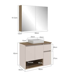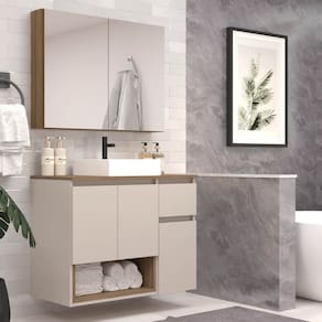 O conjunto de balcão gabinete e espelheira CJ9240 é perfeito para fazer parte do seu banheiro. Possui design moderno e sofisticado e vai deixar sua casa elegante e confortável! A espelheira bem espaçosa possui 2 portas com espelho e 2 prateleiras internas práticas para armazenar produtos de higiene pessoal, medicamentos e acessórios de banheiro e o gabinete possui 3 portas com bastante espaço interno , 1 gaveta e 1 nicho. Acompanha cuba de sobrepôr branca. Acabamento da Cuba: Acetinado Acabamento da Gaveta: Finish Foil Acabamento da Porta: Finish Foil Acabamento da Prateleira: Finish Foil Acompanha Cuba: Sim Acompanha Gaveteiro: Não Acompanha Manual de Instalação: Sim Acompanha Parafusos Para Fixação Na Parede: Sim Acompanha Tampo: Sim Acompanha Válvula: Não Altura do Espelho: 61 cm Ambiente Principal: Banheiro codigo_ean: 7900288138422 Complexidade da Montagem: Média: pode ser montado por mais de uma pessoa e/ou necessite de maior conhecimento para montagem Comprimento da Prateleira: 76,9 cm Cor: Mel/Arenas Cor da Cuba: Branca Cor da Gaveta: Bege Cor da Porta: Bege Cor do Produto: Mel/arenas Cor Flex: Não Cor Interna: Mel/arenas Escala de Brilho: Fosco Escala de Brilho da Gaveta: Fosco Escala de Brilho da Porta: Fosco Escala de Brilho da Prateleira: Fosco Espessura do Espelho: 3 mm Formato da Cuba: Retangular Formato do Espelho: Retangular Formato Espelheira: Retangular Furação para Cuba e Torneira: Não Gaveta com Chave: Não Itens Inclusos: 1 Conjunto Gabinete com Espelheira, Cuba, Kit Ferragens e Manual de Montagem Largura do Espelho: 39 cm Linha ou Coleção: Banheiro Manual de Montagem e Instalação: https://cdn2.madeiramadeira.com.br/atributo/faema/2897982-5225-17462065547424.pdf Marca: FAEMA Material da Cuba: Mármore Sintético Material da Gaveta: MDP Material da Porta: MDP Material da Prateleira: MDP Material do Tampo: MDP Material Principal: MDP Medida da Cuba (C x L x P): 34x33x33 Medida da Espelheira (A x L x P): 61,5x80x12 Medida do Gabinete (A x L x P): 62x80x40 Montagem Flex: Não Necessita Montagem: Sim Origem do Produto: Nacional Peso: 41,5 kg Peso Máximo por Gaveta: 5 kg Peso Máximo por Prateleira: 5 kg Possui Espelheira: Sim Possui Gabinete: Sim Possui Gavetas: 01 Possui iluminação: Não Possui Nichos: Sim Possui Pés: Suspenso Possui Porta de Vidro: Não Possui Portas: 05 Possui Recorte No Tampo Para Cuba: Não Possui Recorte No Tampo Para Misturador: Não Possui Rodízio: Não Possui Sifão: Não Possui Tampo: Sim Possui Tampo de Vidro: Não Produto Montado: Não Quantidade de Espelhos: 02 Espelhos com Tamanhos Iguais Recomendações de Uso, Manutenção e Limpeza: Para a limpeza do móvel utilizar pano levemente umedecido com água Sistema de Montagem: Parafusos,cavilhas e minifix Suporta Até (kg): 55 kg Suporte para Toalheiro: Não Tamanho do Espelho (A x L): 61 x 39 Tamanho do Gabinete: Médio: de 60cm a 80cm de largura Tamanho do Produto: 123x80x40 Tipo de Corrediça da Gaveta: Metálica Simples Tipo de Cuba: Sobrepor Tipo de Dobradiça/Corrediça da Porta: Metálica Tipo de Fixação do Espelho: Silicone Tipo de Gabinete: Gabinete Suspenso Tipo de Gaveta: Externa Tipo de Porta: Bater Tipo de Puxador da Gaveta: Não Contém Tipo de Puxador da Porta: Não Contém