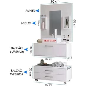 - Balcão superior: 30cm altura / 80cm comprimento / 39cm profundidade