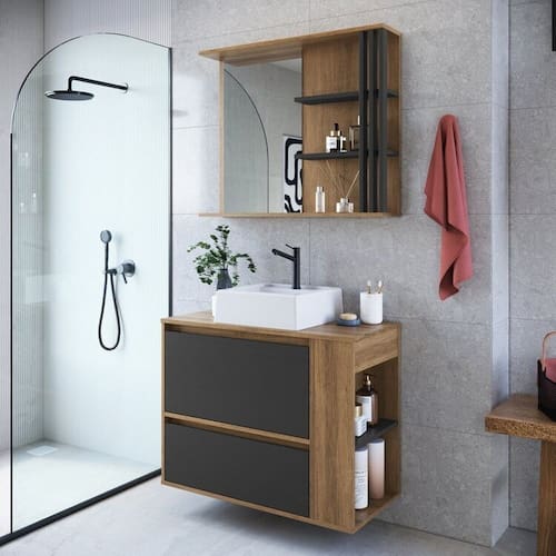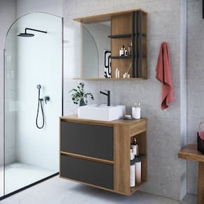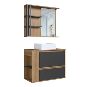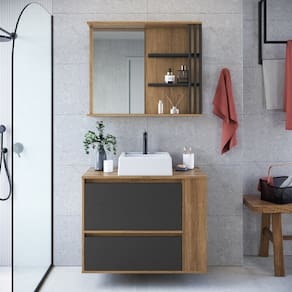 1x Espelheira para Banheiro Estela com 2 Prateleiras Mel/Grafite Largura: 79 cm Altura: 65 cm Peso: 9 kg Profundidade: 14 cm Necessita Montagem: Sim