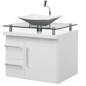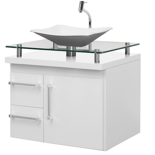 Gabinete - Medida: 555 x 420 x 460mm - Puxadores em aluminio com ponteira em ABS - Cuba em mármore sintético na cor branca - Tampo em MDF com vidro temperado com furos para torneiras e vávula - Corrediças telescópica (250mm) - MDF 15mm pintura UV - Bordas em PVC - Gavetas revestidas em PET, que garantem um perfeito acabamento - Dobradiça com pistão com ângulo de abertura de 110º