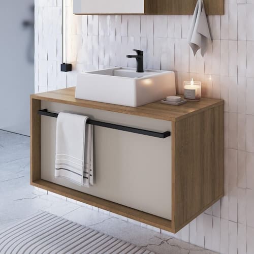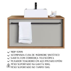 Renove seu espaço com elegância e praticidade utilizando este moderno gabinete para banheiro. Com design sofisticado e cores modernas, ele é perfeito para deixar seu banheiro mais charmoso e requintado. Puxador multifuncional que também serve como toalheiro, fabricado em aço com pintura epóxi, garantindo durabilidade e resistência. 01 gaveta espaçosa, ideal para organizar todos os seus itens pessoais. Instalação sem necessidade de furar paredes, permitindo que suas toalhas fiquem sempre acessíveis e bem acomodadas. Este gabinete versátil é a solução ideal para quem busca aliar praticidade com um toque de sofisticação no banheiro. Acompanha Cuba de Mámore Sintético. Este móvel chegará em sua casa separado em 02 Volumes.