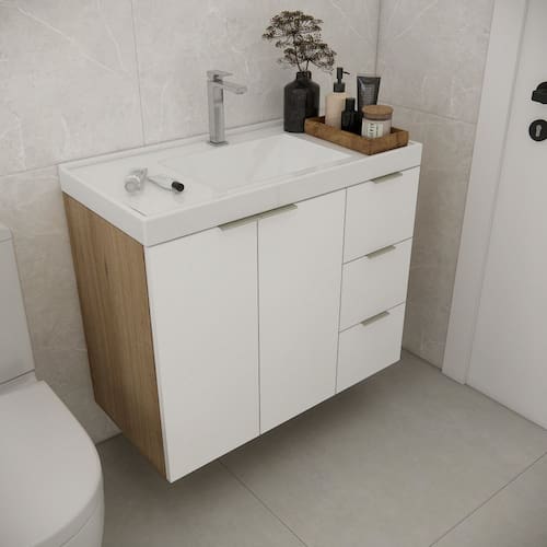 MDF 18cm, Lâmina de borda em PVC, Puxador de metal, Cuba de cerâmicaVendido e entregue por MadeiraMadeira