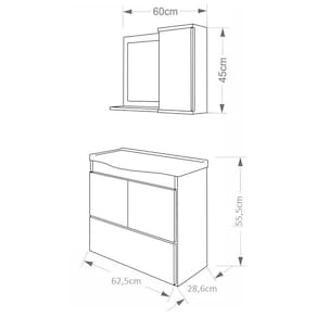 Produto: Gabinete de Banheiro com Cuba e Espelheira Atenas 65cm Branco - MGM Cor: Branco Fabricante: MGM Peso: 19,5 Altura (cm): 56,5 Largura (cm): 63,5 Profundidade (cm): 32,5 Linha: Soft Marca: MGM Móveis Modelo: Atenas Estrutura: 100 % MDF Acabamento: Pintura UV Garantia: 3 Necessita Montagem ?: Não Quantidade de Portas: 3 (1 na espelheira) Quantidade de Gavetas Externas: 1 Quantidade de Gavetas Internas: N/T Quantidade de Prateleiras: 2 na espelheira Possui Toalheiro ?: N/T porta com Pistão a Gás: Não Quantidade de Puxadores: 4 Material do Puxador: Polipropileno Corrediças: Telescópicas Dobradiças: Metálicas Possui Vidro: Não Acompanha Pia: Sim Material da Pia: Mármore Sintético Dimensões da Pia: 9,7 x 63,1 x 32,5