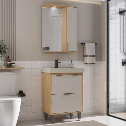 Com um design clean, o Gabinete de Banheiro com Cuba e Espelheira com LED 59cm Multimóveis CR10138 é uma solução para quem procura muito espaço interno sem perder a elegância. Desenvolvido pensando em qualidade e praticidade, este conjunto conta com um tampo com maior profundidade na bacia e, também, com uma espelheira maior do que as convencionais. Produzido em MDP de 15mm com acabamento semibrilho, que garante maior durabilidade e facilidade de limpeza. Possui 3 portas e 1 gavetão central com profundidade reduzida para a instalação hidráulica. Os pés com regulagem de altura facilitam o nivelamento e a limpeza do produto. A espelheira conta com um espelho de 75cm de altura e luminária de LED na parte superior. Os puxadores deixam o produto ainda mais bonito e moderno.