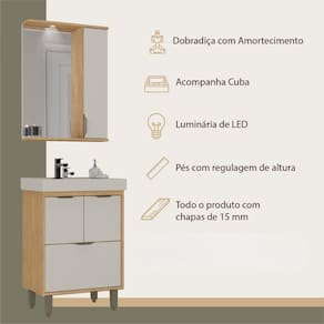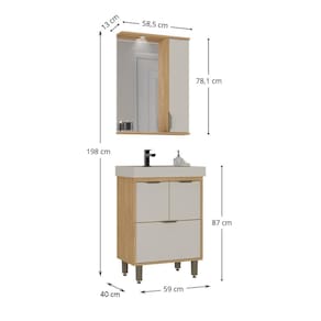 Dimensões do produto montado: Espelheira - Altura: 78,1cm | Largura: 58,5cm | Profundidade: 13cm Balcão com Cuba - Altura: 87cm | Largura: 59cm | Profundidade: 40cm *Você pode consultar as medidas detalhadas na imagem técnica do produto.