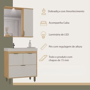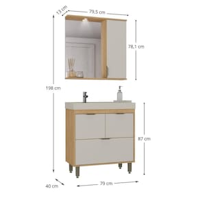 Dimensões do produto montado: Espelheira - Altura: 78,1cm | Largura: 79,5cm | Profundidade: 13cm Balcão com Cuba - Altura: 87cm | Largura: 79cm | Profundidade: 40cm *Você pode consultar as medidas detalhadas na imagem técnica do produto.