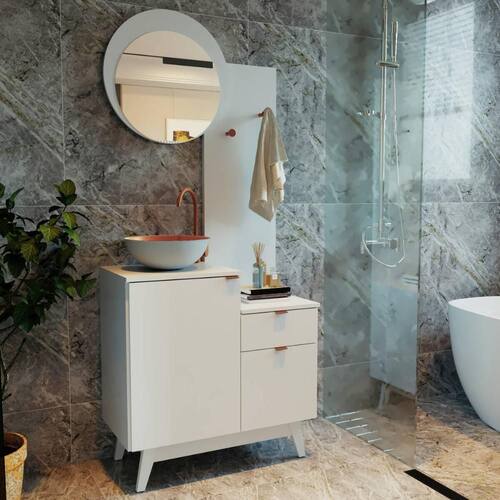 Características: - Produzido em MDP de 15/25mm, unindo leveza e robustez na medida certa. - Acabamento em pintura UV: mais resistência e beleza por muito mais tempo. - Espelho em vidro 3mm que amplia o espaço e valoriza a iluminação do ambiente. - 2 portas e 1 gaveta para manter tudo organizado e sempre à mão. - Gaveta com corrediças metálicas, garantindo abertura suave. - 2 ganchos para toalhas em aço cromado: mais praticidade na rotina. - Pés no estilo retrô em PVC, que elevam o visual e facilitam a limpeza. - Puxadores metálicos práticos e minimalistas. - Montagem reversível: a espelheira e a porta podem ser montadas no lado esquerdo ou direito do móvel.