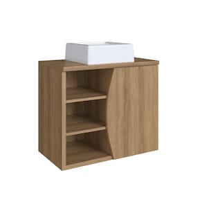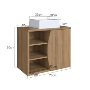 Gabinete: - Cor: Marrom - Dimensões montado (AxLxP): 60 x 70 x 40 cm - Peso: 24,7 kg - Material: MDP 15 mm e 25 mm com acabamento fosco - Fundo: MDP 3 mm - Peso suportado total: até 30 kg - Prateleiras: 3 (espessura: 1,5 cm | suporte: até 10 kg por prateleira) - Portas: 1 porta de bater com dobradiça metálica - Nichos abertos: Sim, 3 espaçosos - Tampo: Incluso (70 x 40 cm | espessura: 2,5 cm) - Cuba: Inclusa, cor branca - Fixação na parede: Sim - Recomendações de limpeza: Usar pano levemente umedecido com água (evitar produtos abrasivos)