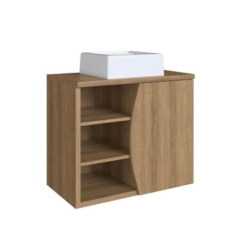 - Design contemporâneo com porta usinada, valorizando o ambiente. - Cuba branca inclusa, pronta para uso, agregando praticidade ao conjunto. - Ótima organização com nichos externos e prateleira interna. - Estrutura durável, produzida em MDP com acabamento fosco. - Ideal para banheiros pequenos e médios, aproveitando bem o espaço.