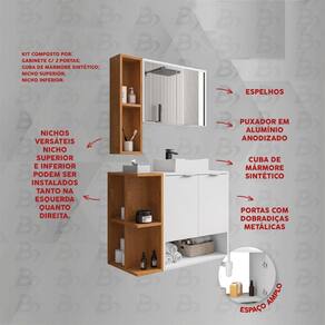 - Produzido em MDP (12/15mm): durabilidade e resistência. - Acabamento em pintura UV. - Balcão com 2 portas e nicho: amplo espaço interno para organização. - Tampo do balcão de 15mm: suporta até 10kg. - Montagem suspensa: facilidade na limpeza do ambiente. - Acompanha cuba de mármore sintético. - Espelheira com 2 portas e espelhos de vidro (3mm). - Nichos laterais superior e inferior podem ser montados em ambos os lados - esquerdo ou direito. - Puxadores em alumínio anodizado.