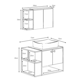 Gabinete para Banheiro suspenso , ele é composto pelo gabinete com tampo cuba suspensa e espelheira , o gabinete possui duas portas, abaixo da porta tem uma prateleira com um espaço, e na sua lateral esquerda possui um nicho com três repartições, a espelheira contém duas portas com os espelhos fixados nelas um bom espaço interno e também no gabinete, para guardar pequenos produtos do dia a dia . Acabamento da Cuba: Esmaltado Acabamento da Porta: MDF Acompanha Cuba: Sim Acompanha Gaveteiro: Não Acompanha Manual de Instalação: Sim Acompanha Parafusos Para Fixação Na Parede: Sim Acompanha Tampo: Sim Acompanha Válvula: Não Altura do Espelho: 37,9 cm Ambiente Principal: Banheiro codigo_ean: 7900288231048 Complexidade da Montagem: Média: pode ser montado por mais de uma pessoa e/ou necessite de maior conhecimento para montagem Cor: Branco/Freijo Cor da Cuba: Branco Cor da Porta: Branco Cor do Produto: Branco/Freijo Cor Interna: Branco Escala de Brilho: Brilhante Escala de Brilho da Porta: Brilhante Espessura do Espelho: 3 mm Formato da Cuba: Retangular Formato do Espelho: Retangular Formato Espelheira: Retangular Furação para Cuba e Torneira: Não Largura do Espelho: 25 cm Manual de Montagem e Instalação: https://product-hub-prd.madeiramadeira.com.br/360080844/documents/63244748-0760-4414-922a-f8cd84962e983210629664217581128623822.pdf Marca: Arte Gabinetes Material da Cuba: Resina Material da Porta: MDF/MDP Material do Puxador da Porta: Plástico Material do Tampo: MDF/MDP Material Principal: MDF/MDP Medida da Cuba (C x L x P): 42x32,5x11 Medida da Espelheira (A x L x P): 54x16x70 Medida do Gabinete (A x L x P): 46,5x70x45 Necessita Montagem: Sim Origem do Produto: Nacional Peso: 21 kg Possui Espelheira: Sim Possui Gabinete: Sim Possui Gavetas: Não Possui iluminação: Não Possui Nichos: Sim Possui Pés: Não Possui Porta de Vidro: Não Possui Recorte No Tampo Para Cuba: Não Possui Recorte No Tampo Para Misturador: Sim Possui Rodízio: Não Possui Sifão: Não Possui Tampo: Sim Possui Tampo de Vidro: Não Produto Montado: Não Quantidade de Espelhos: 02 Espelhos com Tamanhos Iguais Recomendações de Uso, Manutenção e Limpeza: Limpador Multiuso, Lustra móveis Sistema de Montagem: Parafusos,cavilhas,girofix Suporta Até (kg): 2,5 kg Suporte para Toalheiro: Não Tamanho do Espelho (A x L): 37,9x25 Tamanho do Gabinete: Médio: de 60cm a 80cm de largura Tamanho do Produto: 46,5x70x45 Tipo de Cuba: Sobrepor Tipo de Dobradiça/Corrediça da Porta: Com Amortecedor Tipo de Fixação do Espelho: Silicone Tipo de Gabinete: Gabinete Suspenso Tipo de Porta: Abrir Tipo de Puxador da Porta: Externo Marca: Não Informado