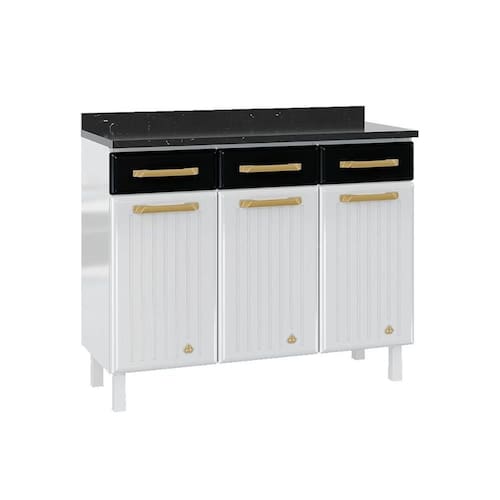 Balcão de Cozinha c/ Tampo Diamante Aço c/ 3 Portas e 3 Gavetas 105cm Branco/Preto - Telasul
